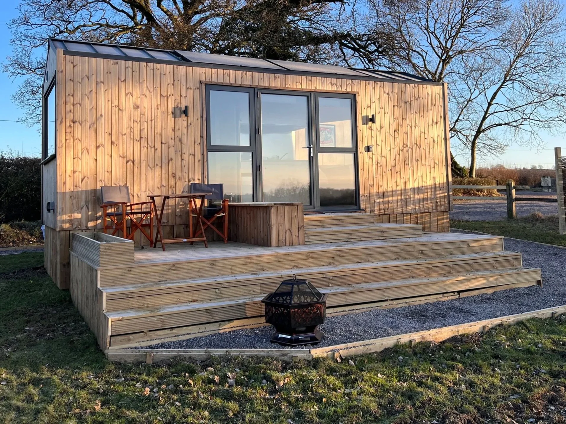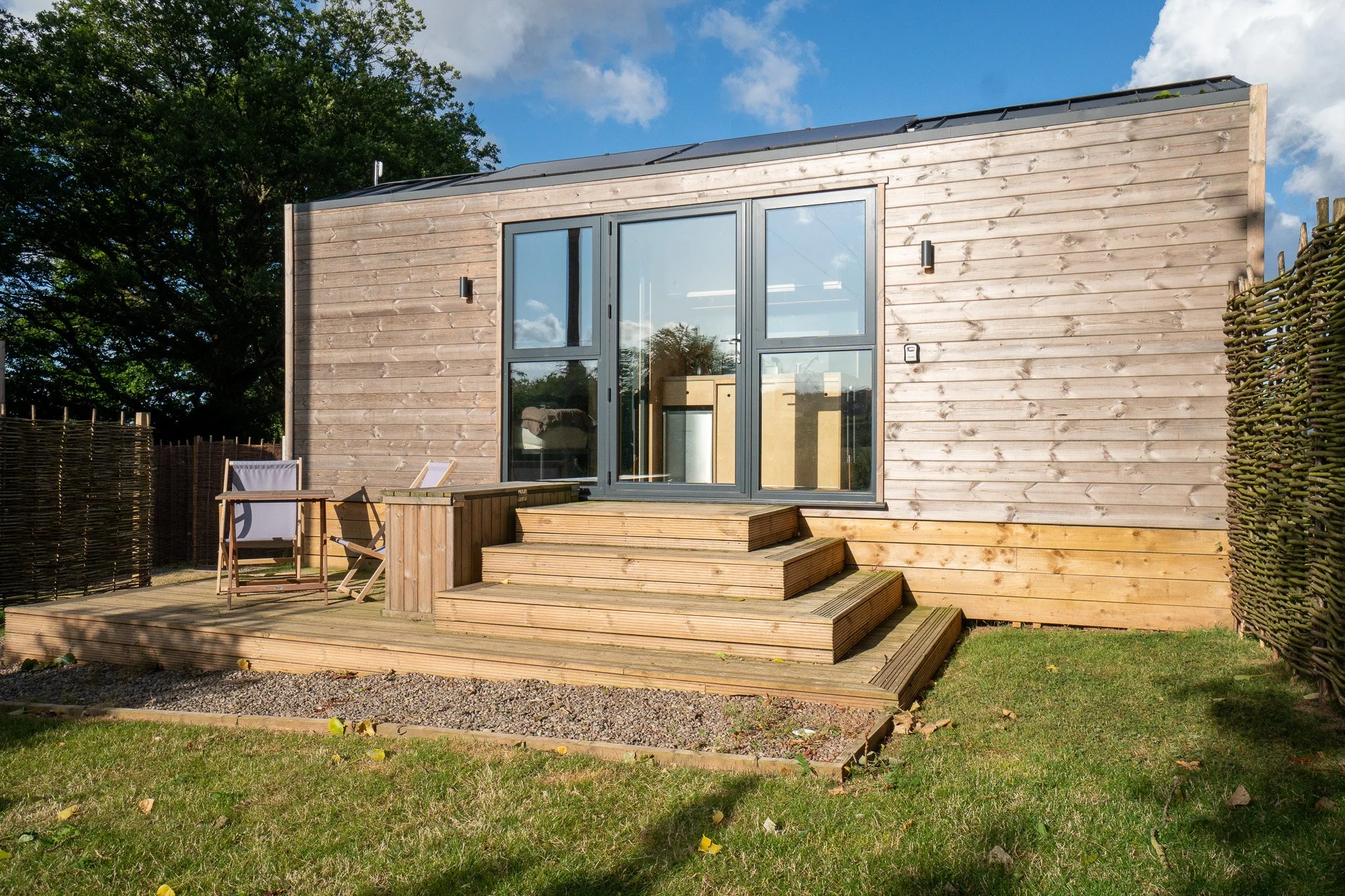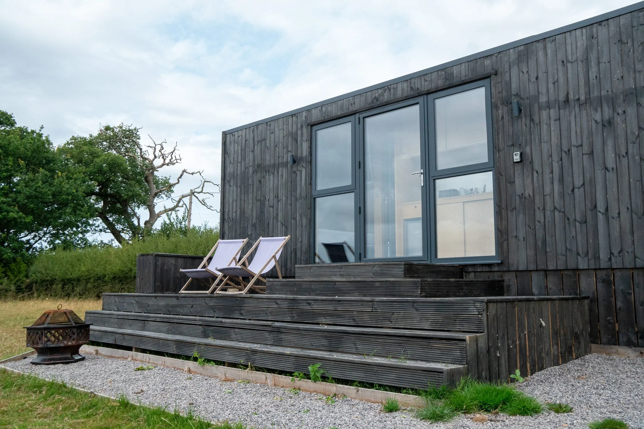 Modern cabin with glass-fronted views over Dorset’s hills, one double bedroom, and a sofa bed.